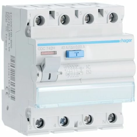 Reiner Differenzialschalter Hager, 4 Module, DIN-Anschluss (universell für jede Schalttafel auf dem Markt), 4P-Pole, Neutralstellung rechts, 40 Ampere, Differenzialstrom Idn 30mA, Spannung 230/400 Vac, AC-Differenzialtyp.