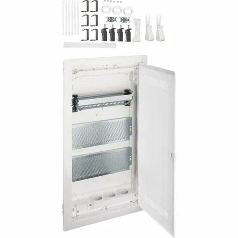 Multimedia, volta, HWV, 3-reihig, mit geschlitzter Kunststofftür. Installationskleinverteiler Hohlwand aus Kunststoff, nach DIN VDE 61439-3, geeignet zum Einsatz in Wohngebäuden nach DIN 18015 und zum Einbau von schutzisolierten VDI Komponenten. Schutzart IP30, Schutzklasse II schutzisoliert. Bestehend aus: Kunststoff-Mauerkasten mit serienmäßigem Leitungsabfang und ausbrechbarem Leitungseinführungsschieber mit Schnappbefestigung, integrierter Wasserwaage. Hohlwandbefestigung mit Schnellfixierungshebel, seitlich oder oben/unten montierbar. Verdrehbarer Blendrahmen mit Lüftungstür aus Stahlblech mit geschlitztem Kunststoffeinsatz für ein besseres WLAN-Signal, pulverbeschichtet und eingebrannt, mit 15 mm Putzausgleich. Lüftungstür, frontbündig mit innenliegenden handbedienbaren Scharnieren. Türverschluss mit frontbündiger Griffmulde und selbsttätig zurückklappendem Griff. Türanschlag rechts oder links ohne Blendrahmen-Demontage. Oberer Anschlussraum: Patch Panel und DIN-Hutschiene isoliert aufgerastet zur Aufnahme von unterschiedlichen Kommunikationsmodulen, für den geforderten Funktionspotentialausgleich nach DIN EN 50310 (VDE 0800-2-310) sind am Patch Panel 2 Schraubbefestigungen vorhanden. Beschriftungsmöglichkeit mit beiliegendem Bezeichnungsstreifen zur Portbeschriftung. Vormontierte gelochte Montageplatten aus verzinktem Stahlblech mit 3,2 mm Lochung sind eingebaut. Ein Universalhaltebügel kann für die schraublose Befestigung von VDI-Komponenten direkt auf dem Lochblech eingehängt werden. Im unteren Anschlussraum ist eine 3-fach Schutzkontaktsteckdose (90° drehbar) montiert. Über eine Anschlussklemme sind die Steckdosen direkt anschließbar. Die Steckdosen sind mit einer beiliegenden Schutzkontaktabdeckung zur Einhaltung der Schutzklasse II bestückbar. Hinweis: Ein Überspannungsschutzmodul Typ 3 kann direkt angeschlossen werden (nicht enthalten).