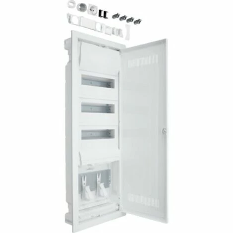 Hybrid, volta, Unterputz, 36PLE, 1 Montageplatten, Steckdose und Kunststofftür. Installationskleinverteiler für Hohlwandeinbau aus Kunststoff, geprüft nach DIN VDE 60670-24 und DIN 43 871. Bemessungsspannung 400V/50 Hz. Schutzart IP30, Bestehend aus Kunststoff-Mauerkasten mit serienmäßigem Leitungsabfang und ausbrechbaren Leitungseinführungsschieber mit Schnappbefestigung sowie integrierter Wasserwaage. Hohlwandbefestigung mit Schnellfixierungshebel, seitlich oder oben / unten montierbar. Blendrahmen aus Stahlblech, pulverbeschichtet und eingebrannt. 15 mm Putzausgleich möglich. Lüftungstür mit nicht transparenter Kunststoffplatte zur besseren Ausbreitung des WLAN-Signals gegenüber einer Blechtür. Lüftungsschlitze unten und oben in der Kunststoffplatte, um die Verlustwärme besser abführen zu können. Schutzart IP30, weiß RAL9010, frontbündig mit innenliegenden, handbedienbaren Scharnieren. Türverschluss mit frontbündiger Griffmulde und selbsttätig zurückklappendem Griff. Türanschlag rechts oder links ohne Blendrahmendemontage. 2-reihiger Geräteträger aus verzinktem Stahlblech. 2-reihige Geräteabdeckung aus Kunststoff für 36 (42) Module mit 46 mm Geräteschlitz, Schnellverschlussbefestigung mit 90°-Drehung an dem Leitungseinführungsschieber und an der Abschottung, an beiden Seiten serienmäßig plombierbar. Fingersichere PE/N-Klemme mit Stecktechnik in montagefreundlicher Schnapptechnik. Zur sicheren Trennung zwischen Multimediateil und Stromkreisverteilung ist eine Abschottung montiert, die gleichzeitig auch die Aufnahme für bis zu zwei Steckdosen ermöglicht. Großzügiger Montageraum mit vormontierter/n Montageplatte/n aus verzinktem Stahlblech mit 3,2mm regelmäßiger Lochung nach DIN 24041. Gerätehalter für die schraublose Befestigung von Geräten zur direkten Montage auf dem Lochblech durch einhängen oder verschrauben liegen bei. Kabelführungsklammern können in den dafür vorgesehenen Schnellbefestigungen links und rechts eingebaut werden.